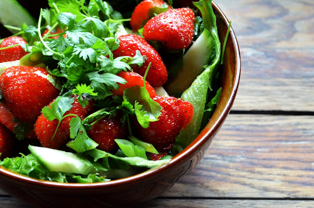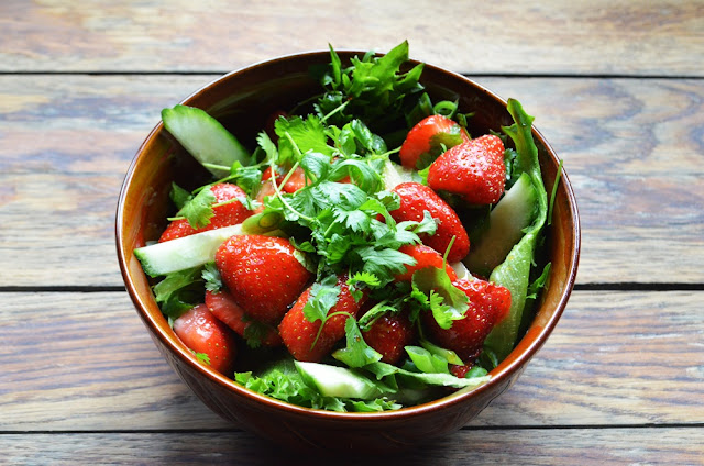 Frukt i salat er ingen ting nytt. Du har mest sannsynlig spist cherry-tomater i salater uten å engang tenke over at det per botanisk definisjonen er et bær? Eller at avokado er en frukt? Vil du ta fruktsalaten (he he) et lite steg videre, er denne jordbærsalaten et utmerket sted å begynne. Den er både frisk og søt på en gang, og gjør seg like godt som tilbehør på koldtbordet eller til grillmaten, som en egen rett. Og den er uhyre enkel! Vil du gjøre den mer avansert og mettende, kan du f.eks tilsette dampet asparges eller ristede valnøtter. Skal du lage til mange, bør du kanskje doble eller triple eller kvadruple.